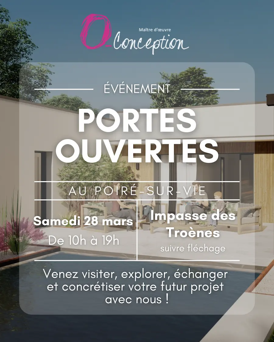 Le samedi 28 mars, nous vous ouvrons les portes d'une réalisation contemporaine au cœur du Bocage Vendéen. Une occasion privilégiée de découvrir notre savoir-faire, d'explorer chaque détail de conception et d'échanger avec notre équipe sur votre propre projet de construction.