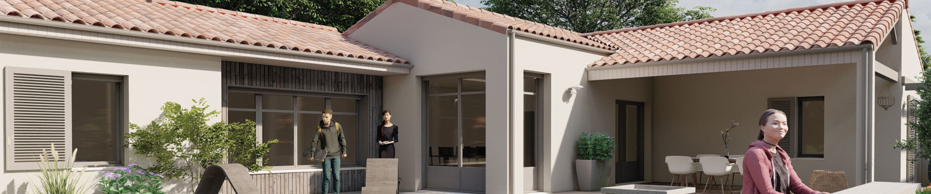 Conception d'une maison traditionnelle typiquement vendéenne avec volets battants, verrière et pergola.